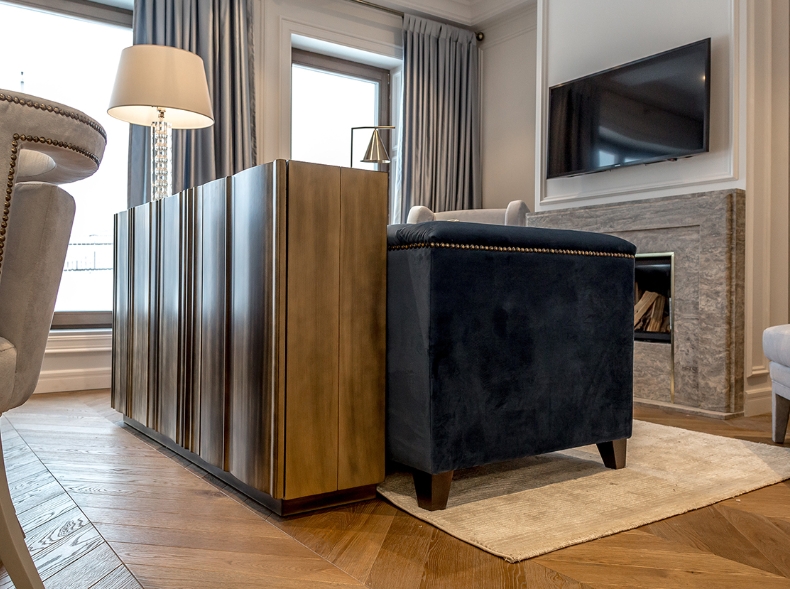 Ресепшен, выполненный в спортивном комплексе с бассейном, стал ярким примером современного дизайна и функциональности. Визуально он оформлен под белый мрамор, создающий эффект литого камня. На практике основа состоит из ЛДСП от австрийской компании Egger, а каркас включает в себя внутренние ящики и выдвижные системы.